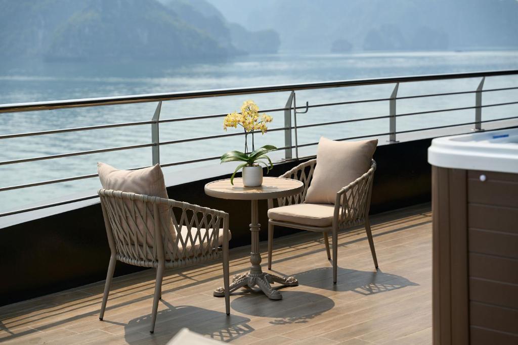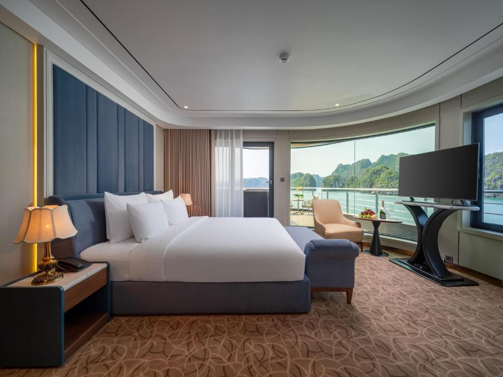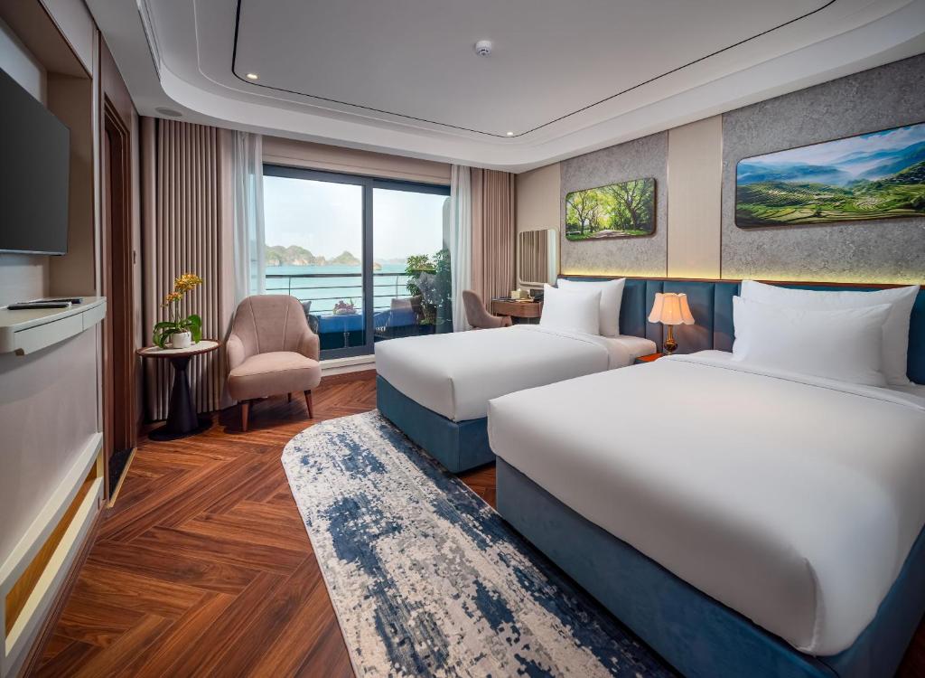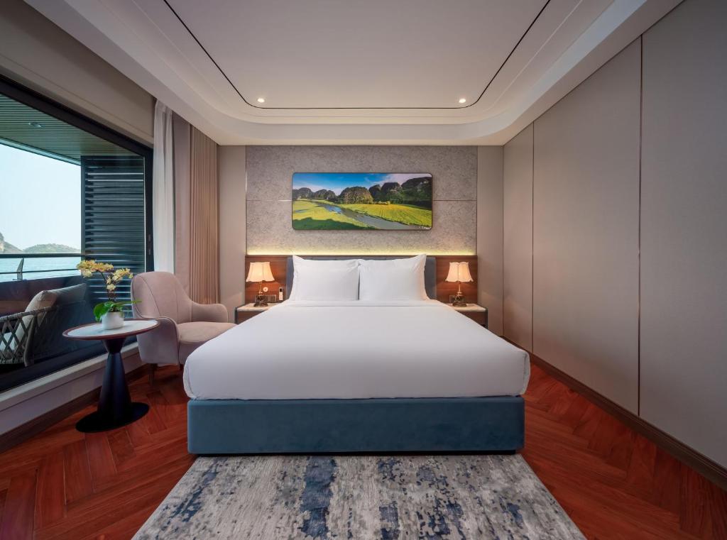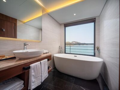 | Calista Bay | ≈ 32 sqm | First Deck | King-size or twin beds | Private balcony, ocean-view bathtub, luxury bedding, and elegant Vietnamese décor. Slightly larger space and enhanced comfort for a serene bay experience. |
