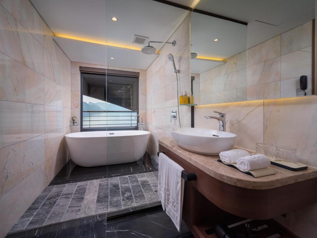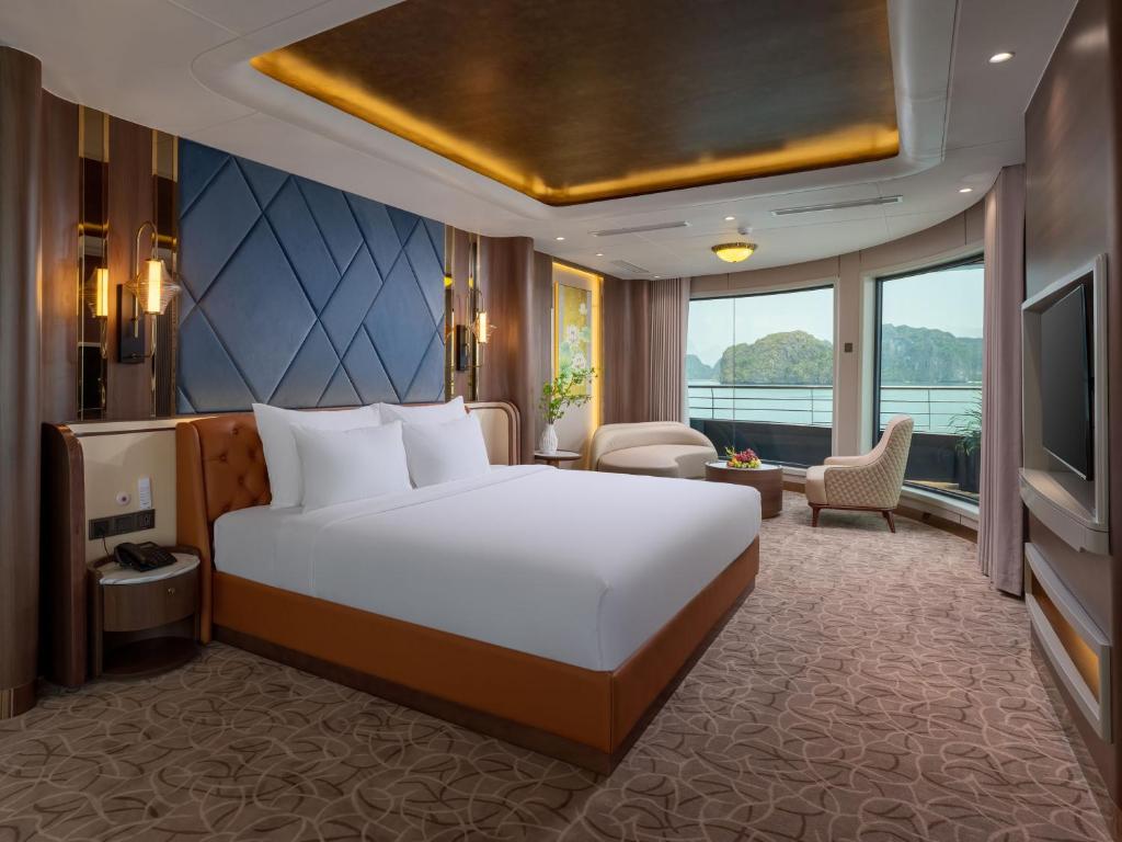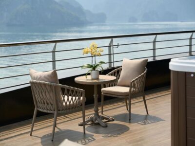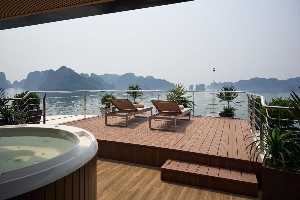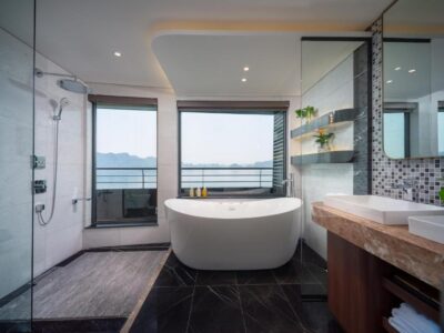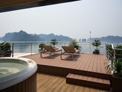 Jacuzzi suites overlooking limestone cliffs — among the most Instagrammable cruise cabins in Halong Bay.