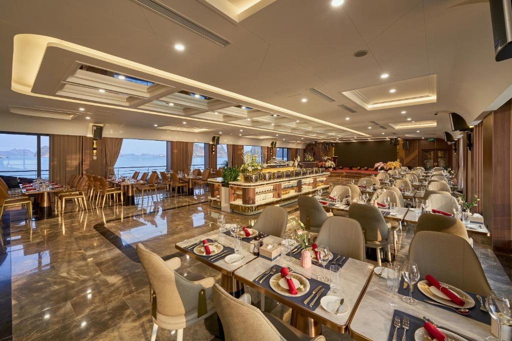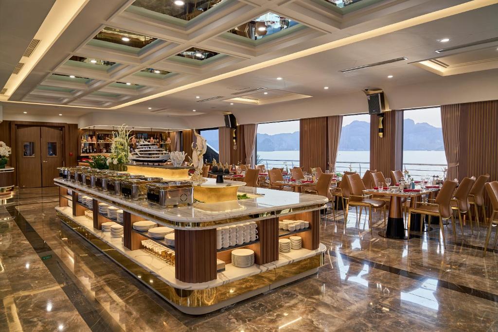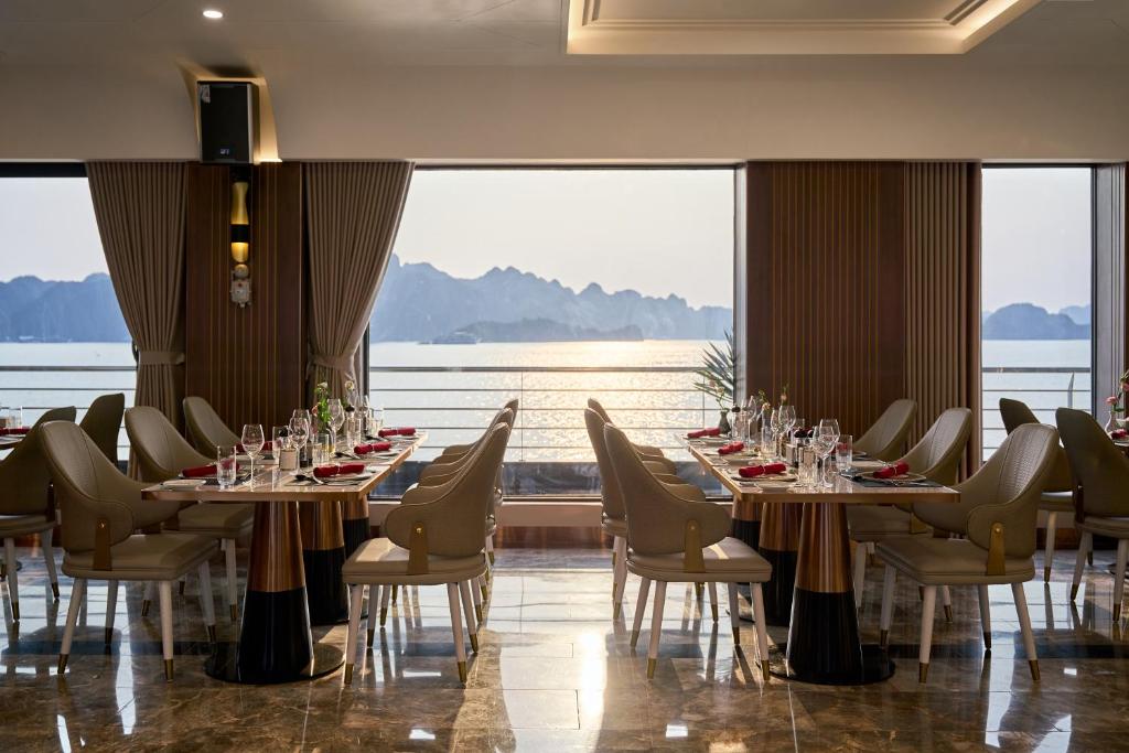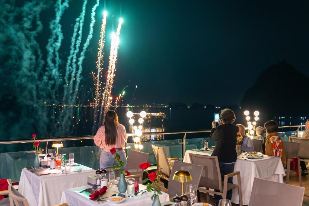 Indoor & outdoor bars, wine and cigar cellar, and sunset cocktail lounge overlooking Halong Bay.