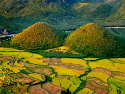 As you ride into the Quan Ba Valley, you’ll come across the mystical Quan Ba Twin Mountains. These perfectly rounded limestone hills, nicknamed the “Fairy Bosom,” are surrounded by green rice fields and misty backdrops.