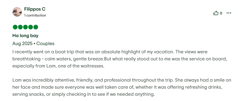 These genuine traveler experiences build trust and showcase why our cruises are among the best Halong Bay packages available.